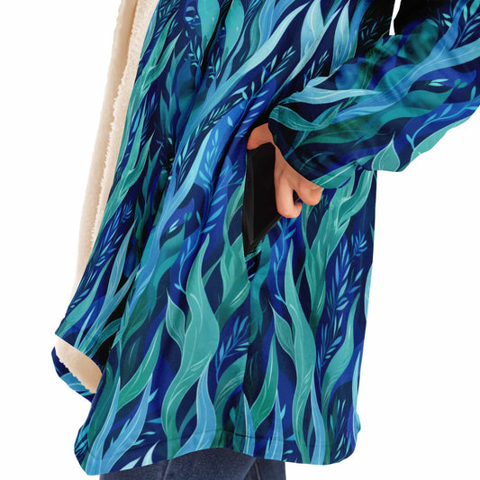 Flannel Blanket Poncho – Abstract Blue Wave Art, Modern Cozy Wrap with Flow & Depth