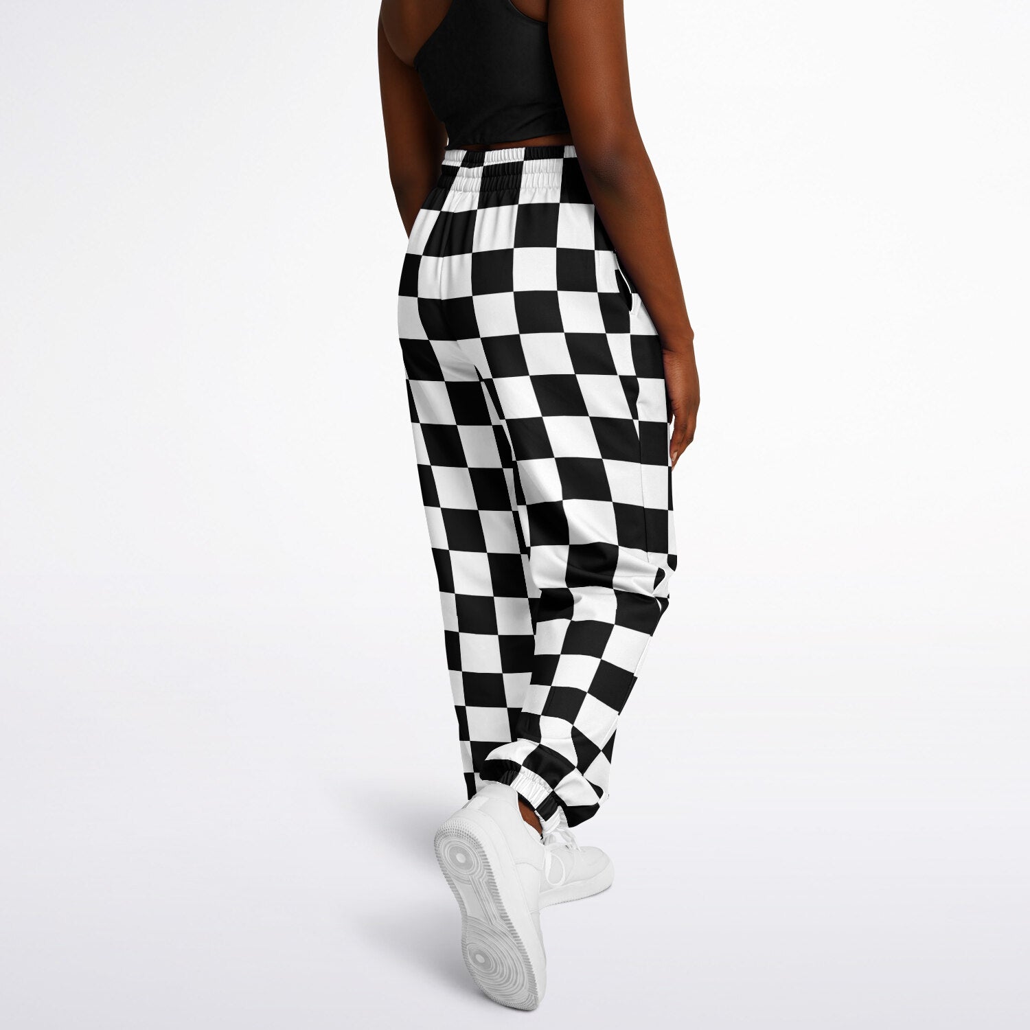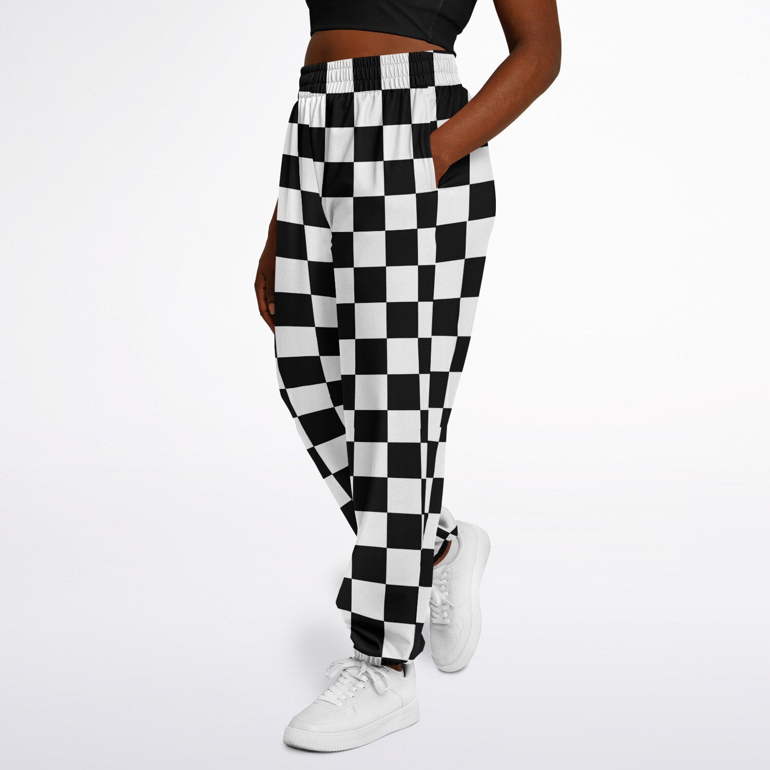 Black White Checkered Women's Track Pants, Eco-Friendly Check Straight Leg Quick Dry Festival Elastic Waist Windbreaker Tracksuit