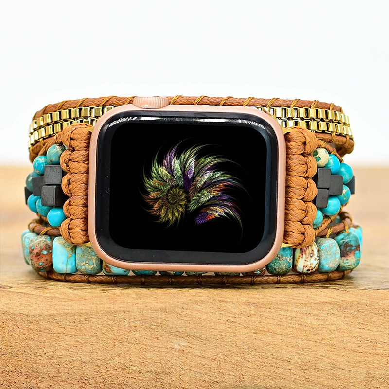 Transform your Apple Watch into a stunning piece of art with our Large Turquoise Bead Watch Band Boho. Crafted from beautiful stone, this bohemian-style strap not only adds a touch of elegance but also showcases your unique personality.