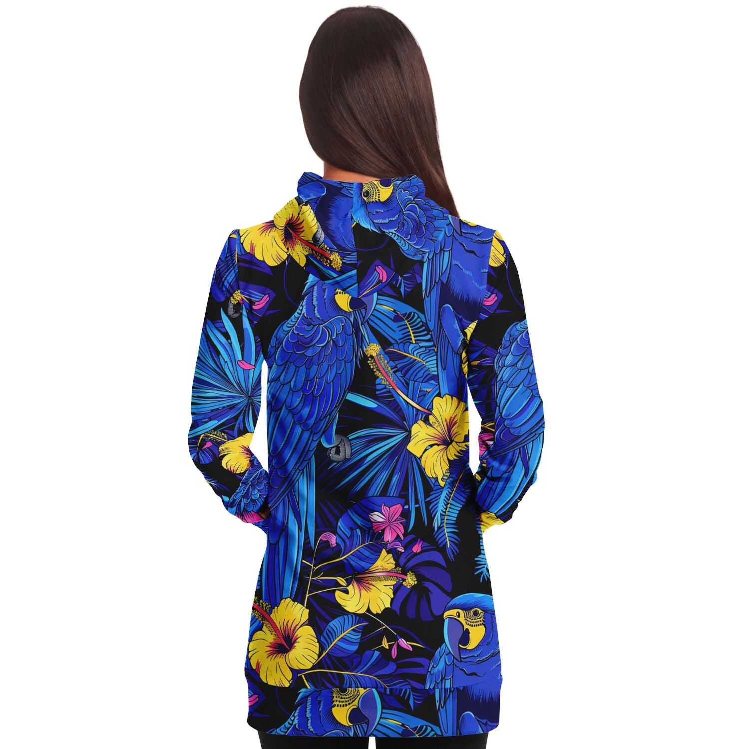 Fashion Longline Hoodie #colorful #vibrant #nature #macaws #foliage #exotic #floral #tropical #parrots #palm-leaves #wildlife #jungle #fashion #illustration #flowers #hibiscus