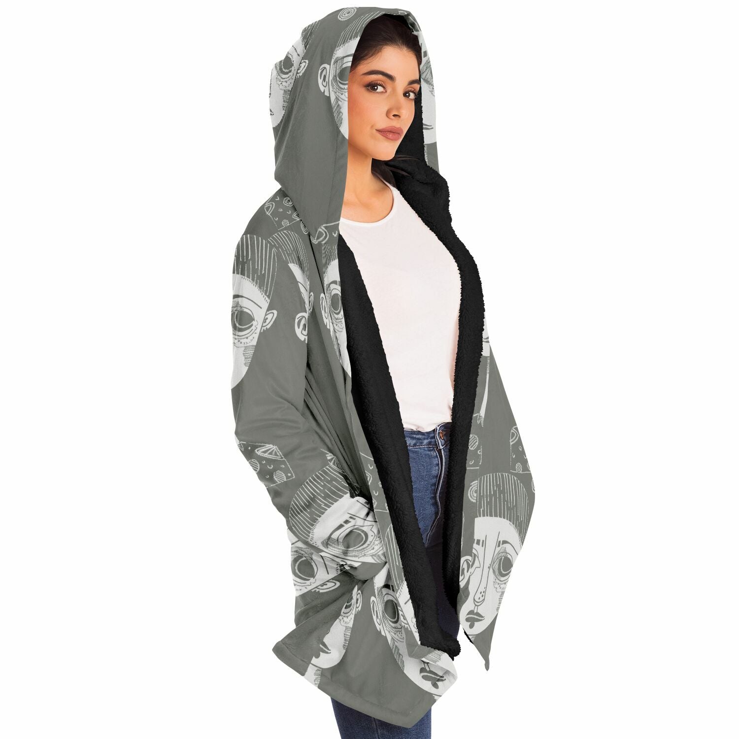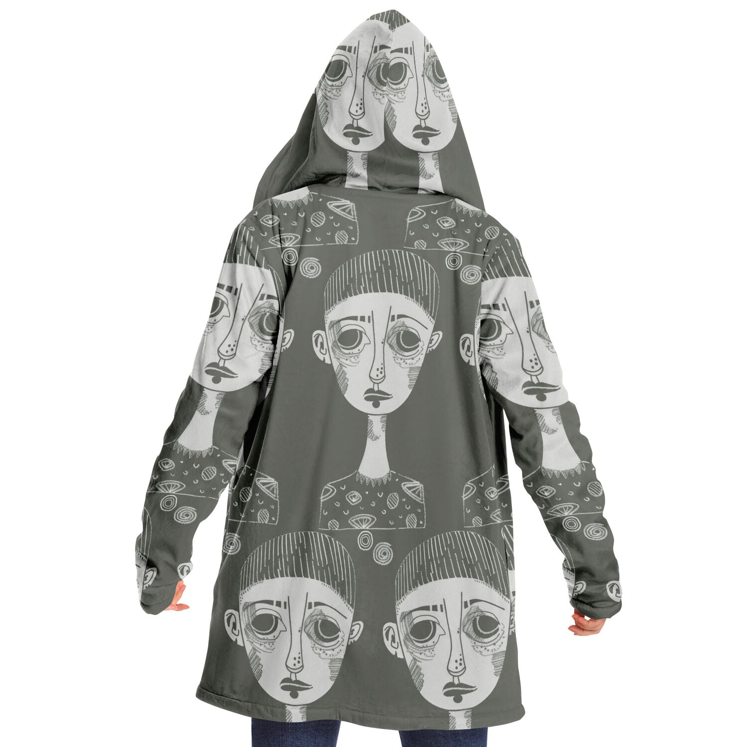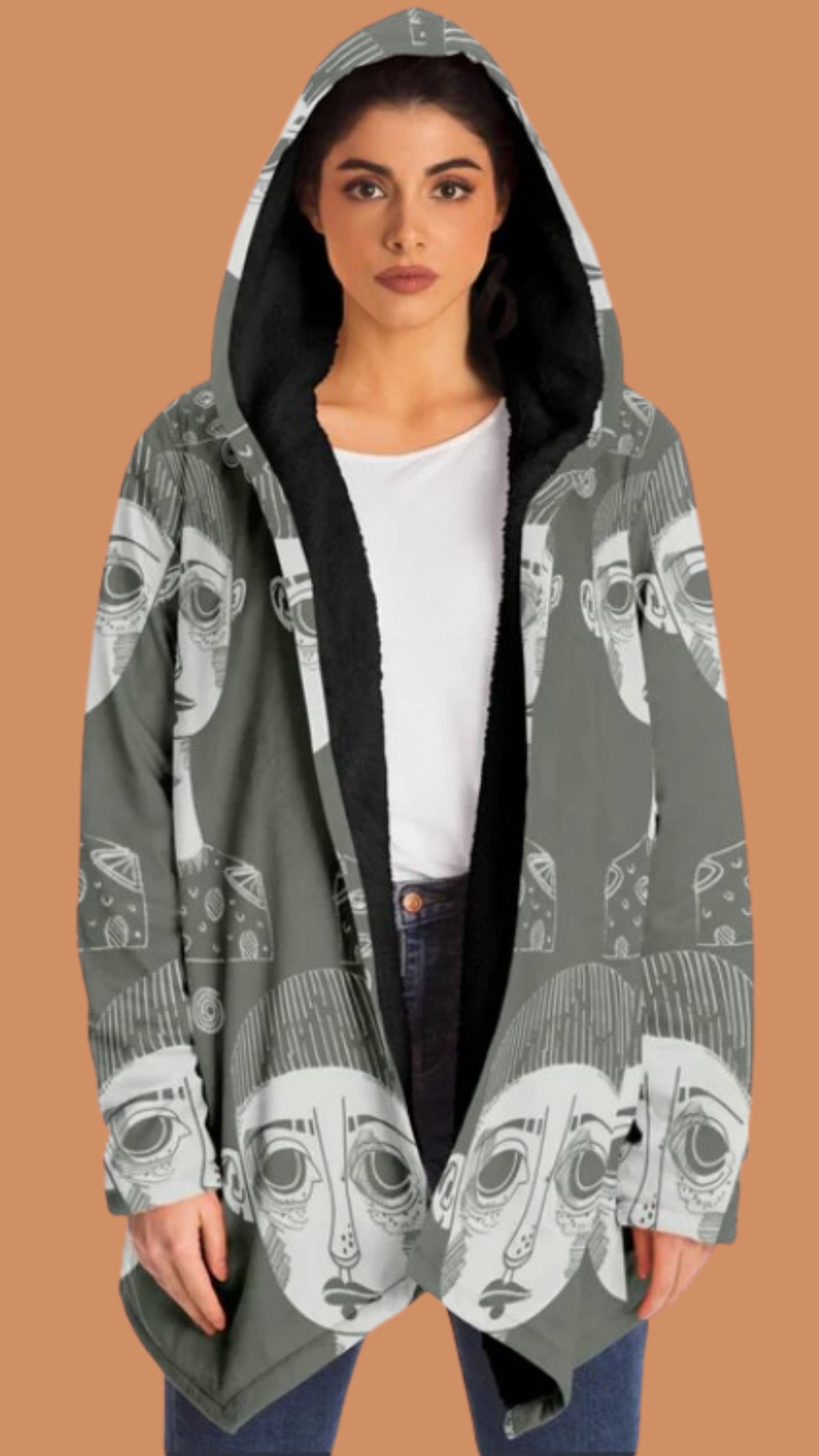 Step into a world of bold creativity with this grayscale stylized portrait cloak, blending abstract expressionism and comic-inspired illustration into one wearable masterpiece. Designed for lovers of abstract art, artistic fashion, and unconventional outfits, this hooded cloak makes a statement whether you’re channeling boho street style, hippie elegante vibes, or simply searching for a unique cloak aesthetic.