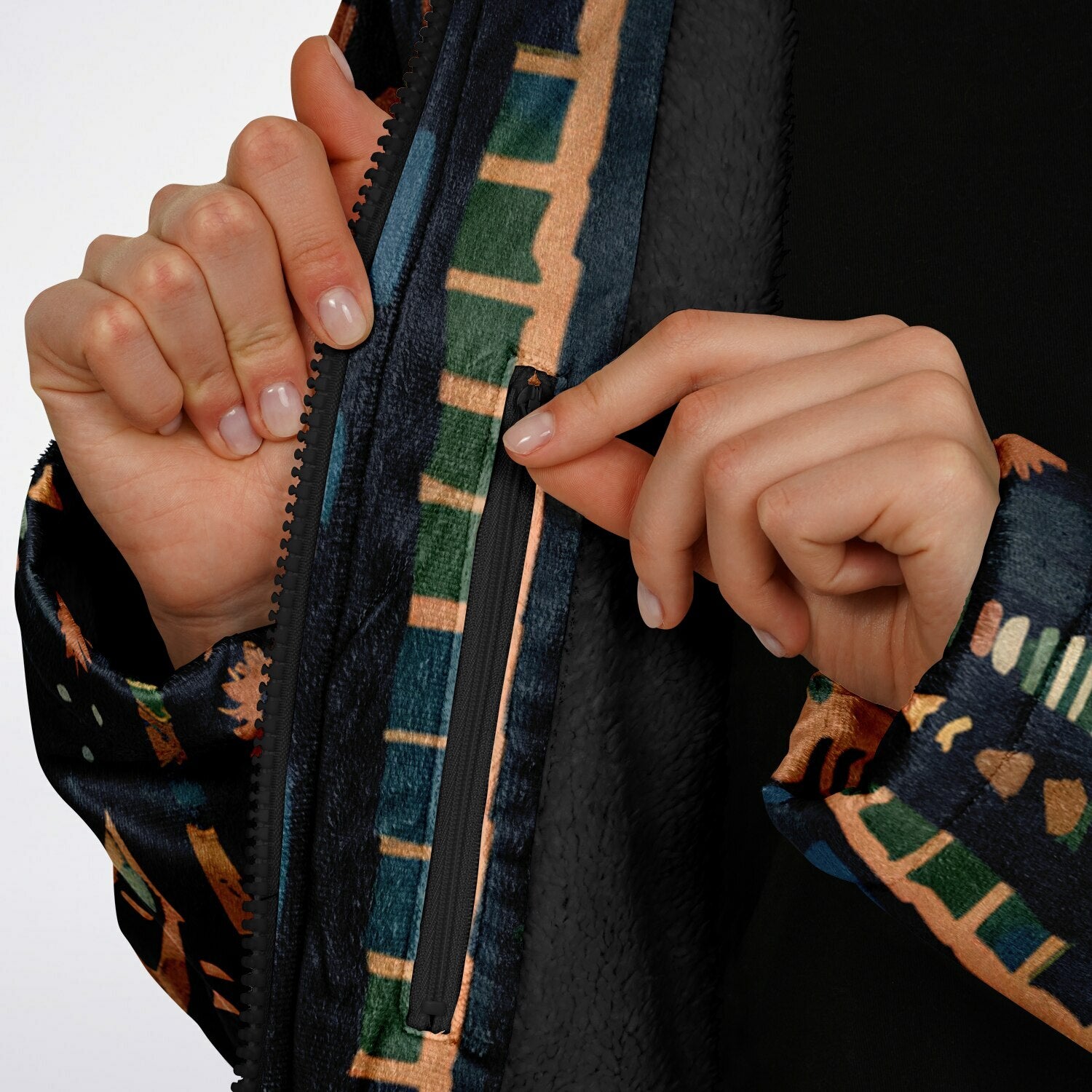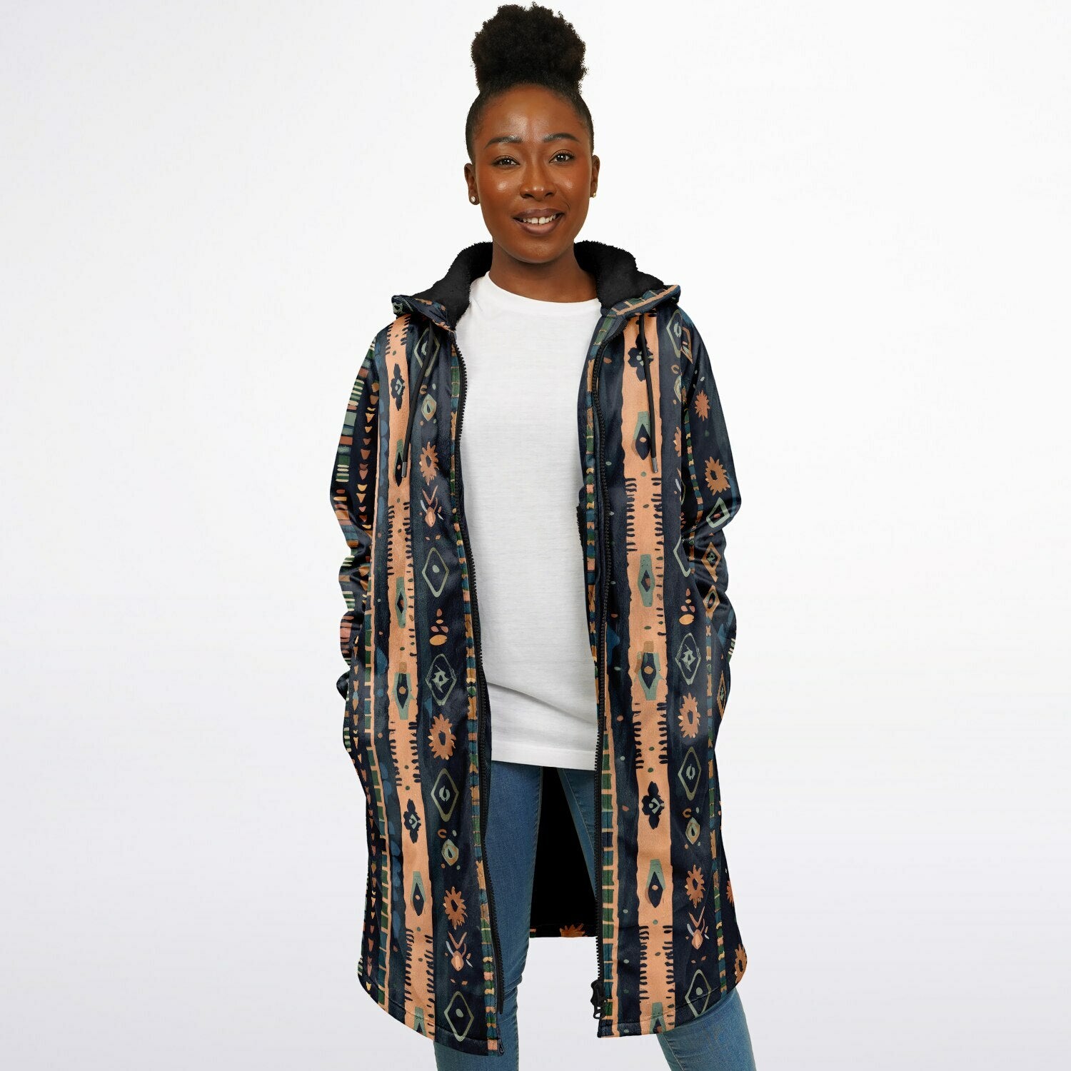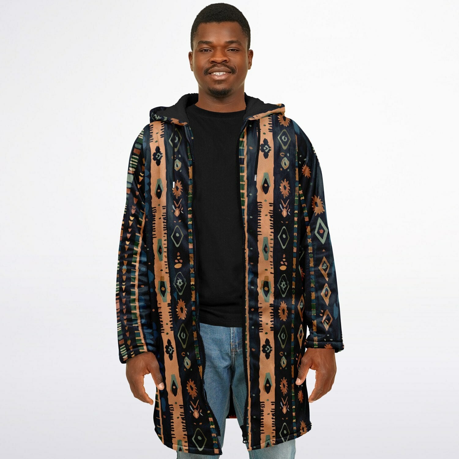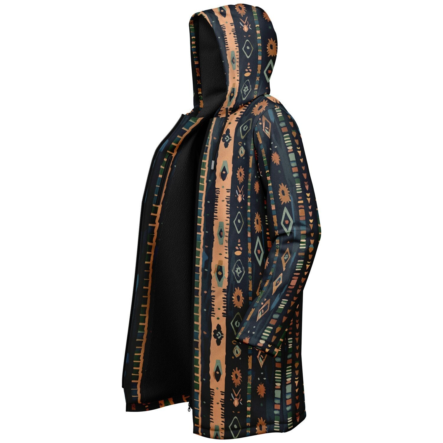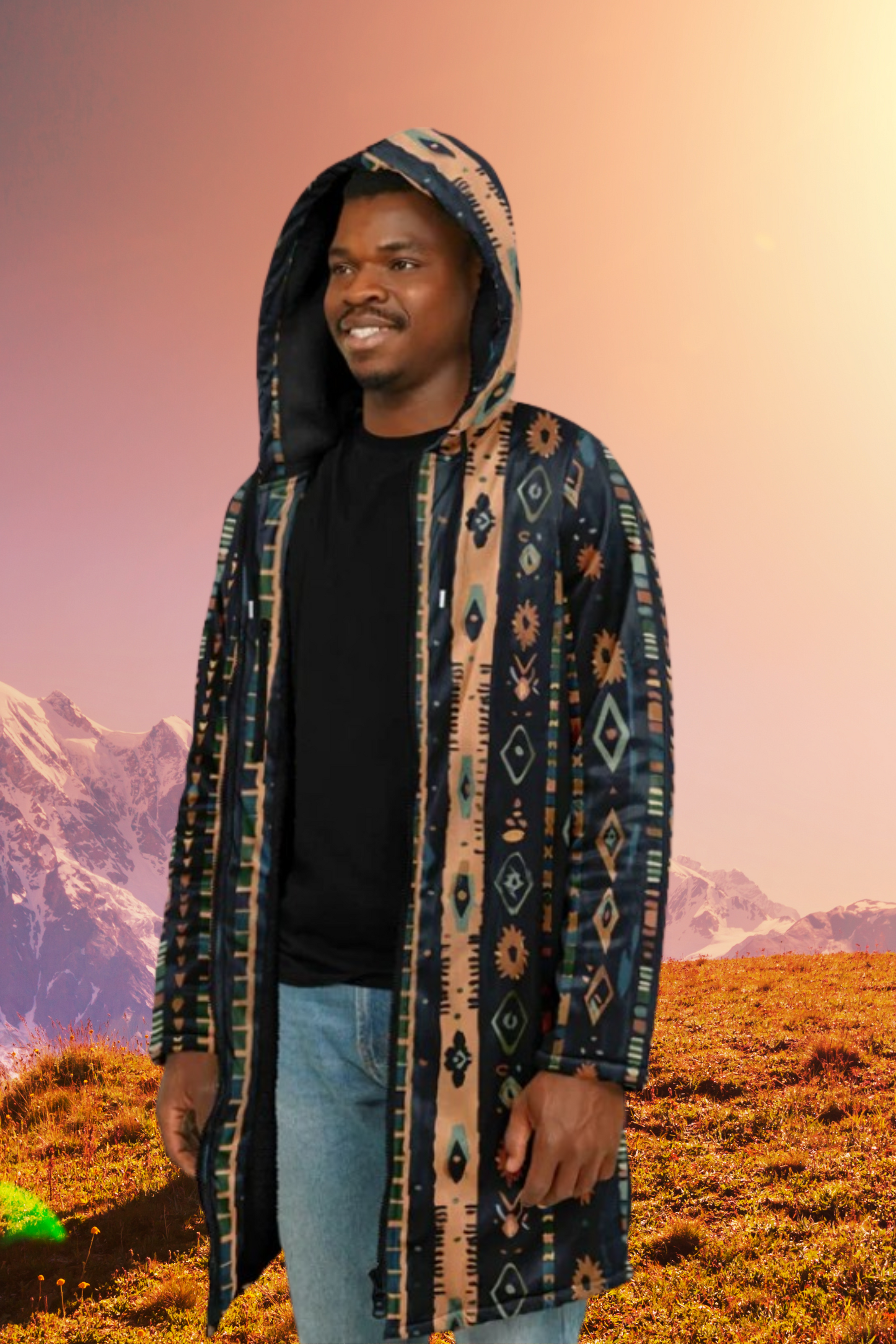 Step into symmetry with this custom Zipper Cloak, a bold fusion of geometric shapes, tribal patterns, and rich floral motifs. With its dark-and-light contrasts and rhythmic repetition, this cloak is basically wearable abstract art. Perfect for lovers of boho street style and tribal coats, it’s textured, unique, and effortlessly chic. Who needs ordinary when you can wear symmetry?
