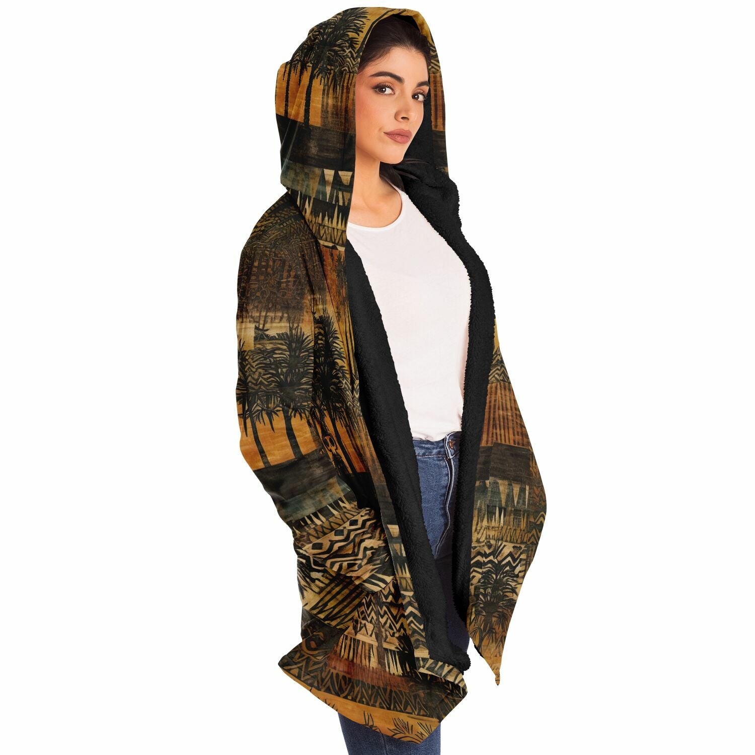 Channel bold energy with this tribal hooded cloak, a statement piece that blends African-inspired patterns, abstract palm tree vibes, and effortless boho street style. Whether you’re chasing sunsets, wandering festivals, or just elevating your everyday look, this tribal coat is the definition of boho men style.