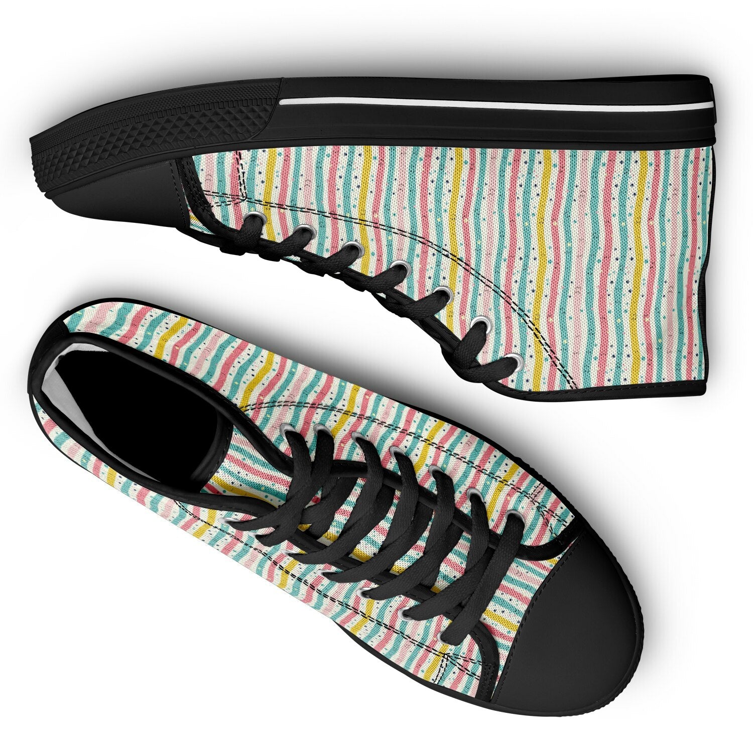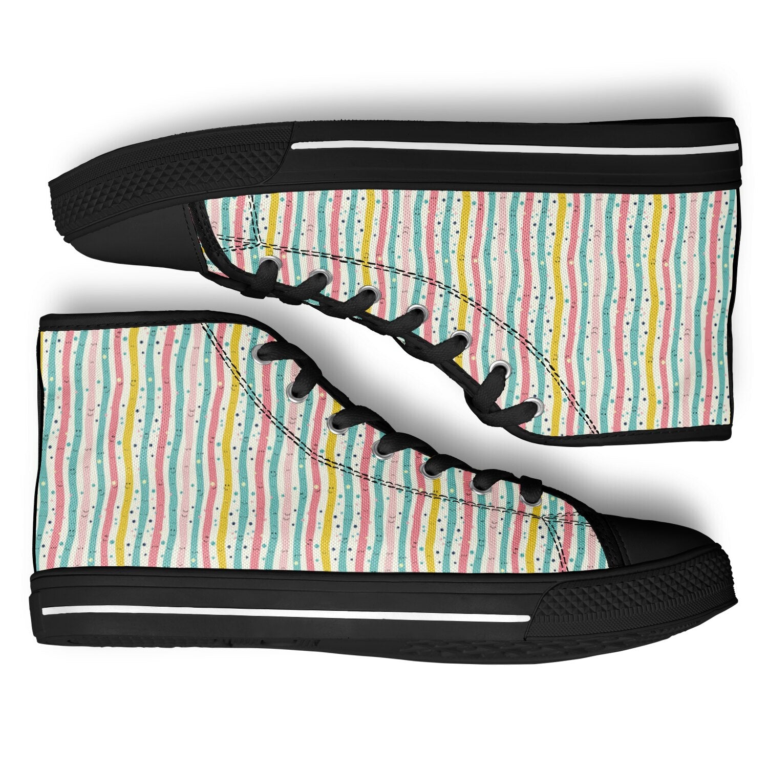 urban peak shoes, whimsical sneakers, pastel high tops, hand drawn shoes, playful sneakers, joyful footwear, smiling faces shoes, children’s book style shoes, friendly aesthetic sneakers, soft pastel sneakers, unique streetwear shoes, wavy line shoes, artistic pattern sneakers