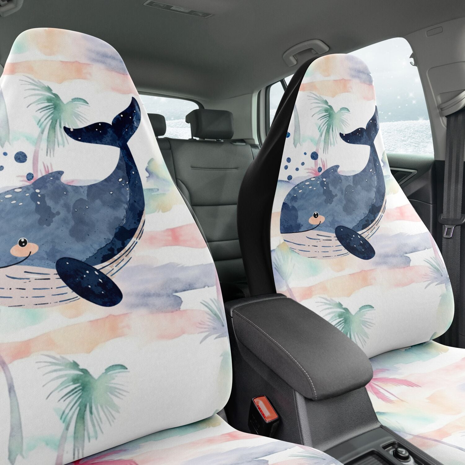 whale car seat cover, ocean car seat cover, watercolor car seat cover, whimsical car seat cover, marine life seat cover, sea life car accessories, cute animal car seat cover, underwater theme seat cover, children’s book style car seat cover, blue car seat cover