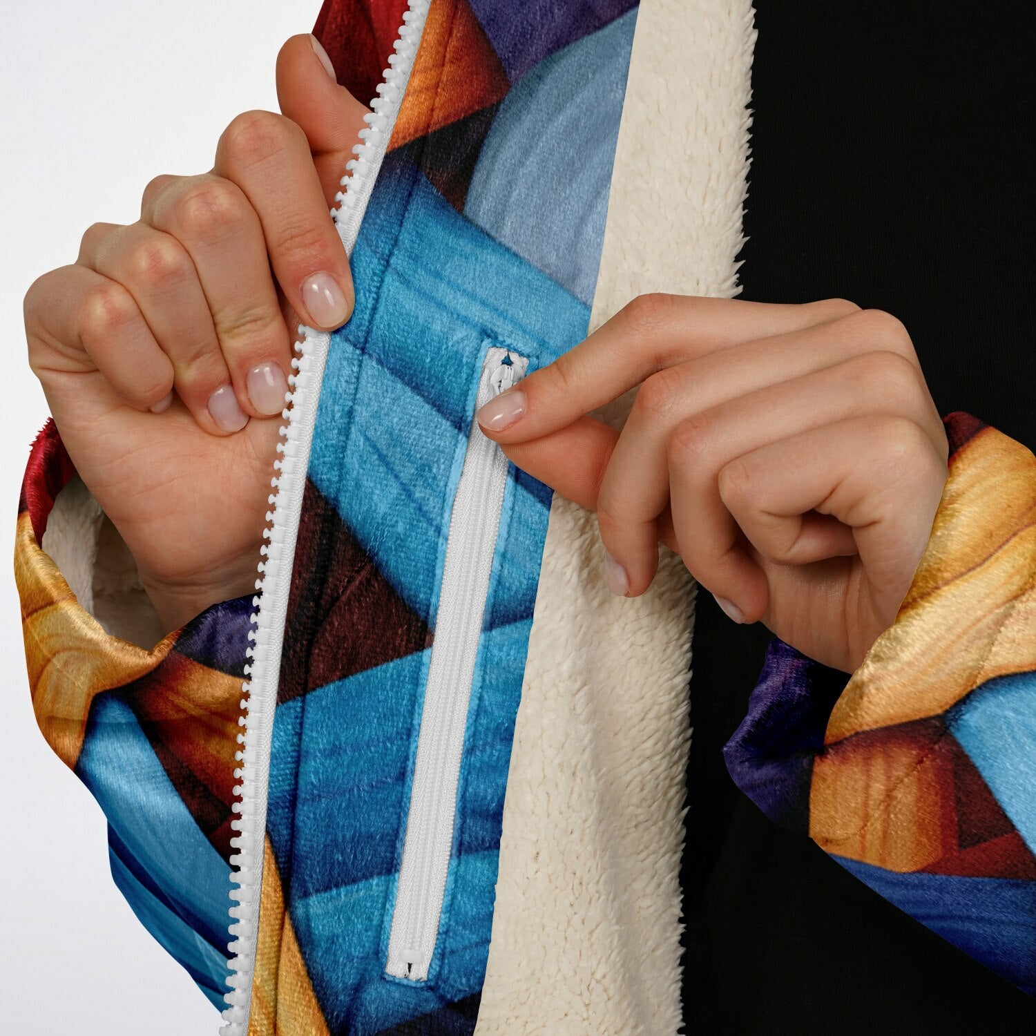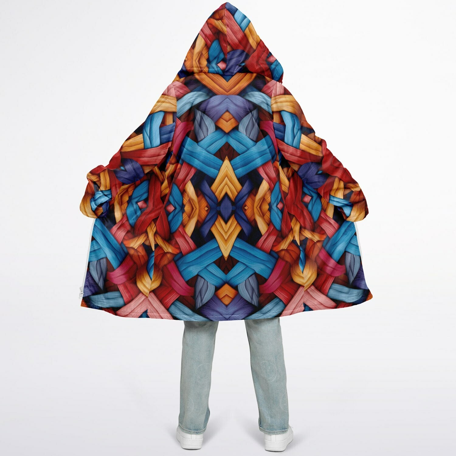 Zipper Cloak β Bold Blue & Red Weave Pattern, Creative Boho Hooded Wrap